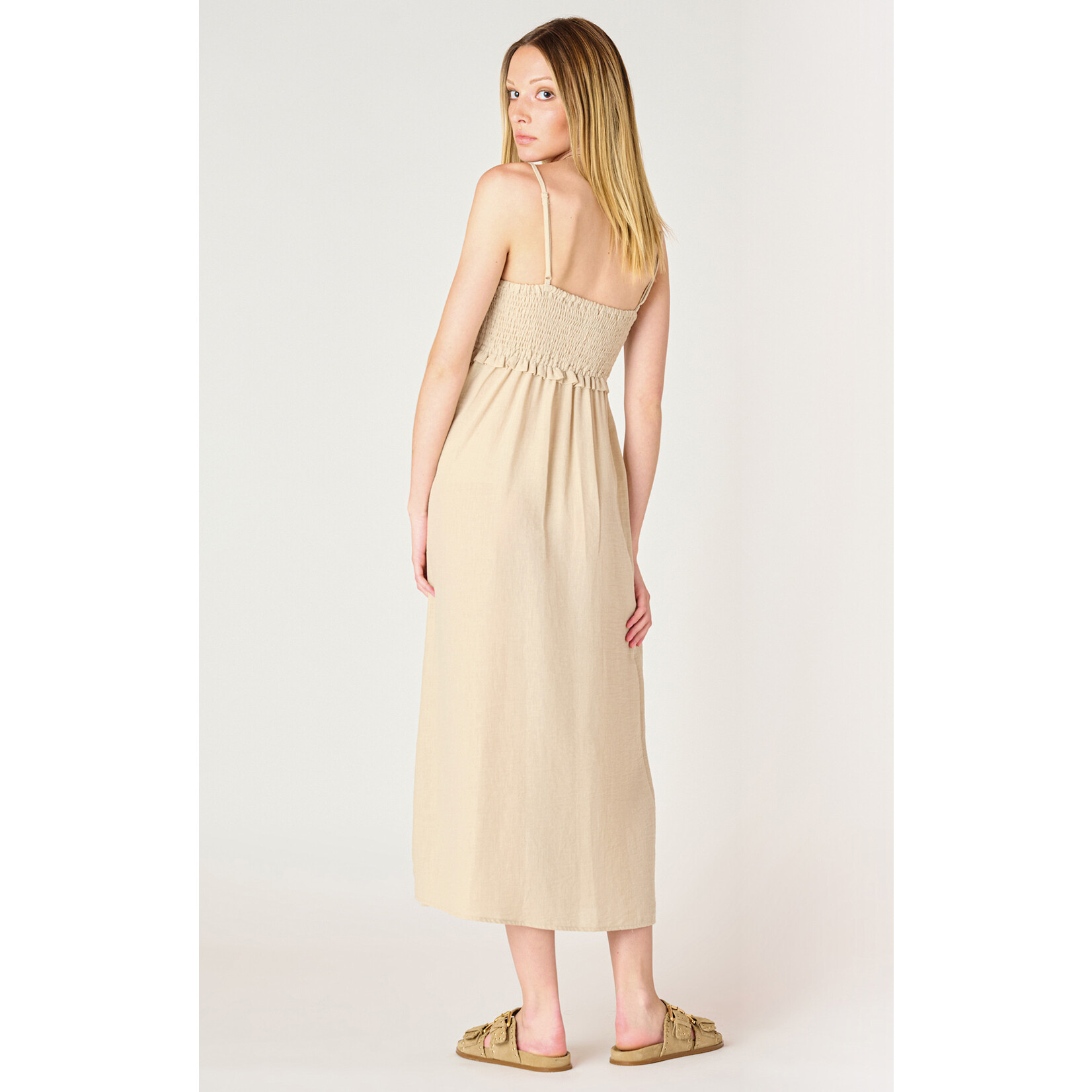 Khaki smocked bodice midi maxi dress with beaded detailed strap. Pair with your favorite sandal or white sneaker and denim jacket