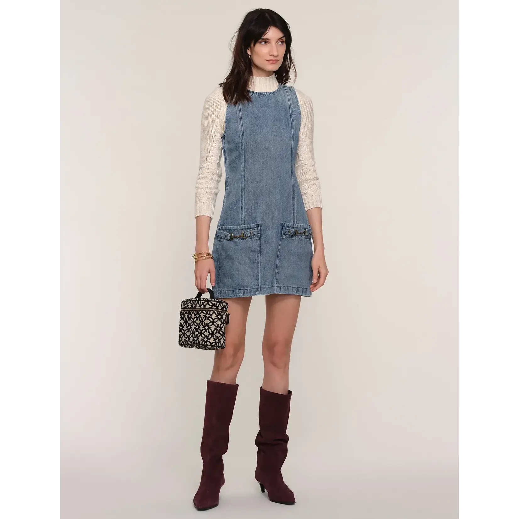 The Ginny Dress is a soft, denim mini. It featured a crew-neck, slim fit and patch pockets. We love it worn over any slim fit sweater and a pair of boots.
